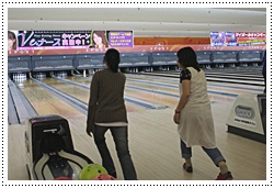 พออิ่มก็ขับรถไปต่อที่ร้าน Pashinko & slot แล้วพวกเค้าก็หลอกเราว่า เดี๋ยวก็กลับแล้ว ครั้งเดียว เราก็ตกใจ จะให้เล่น Pashinko & slot เนี่ยนะ ตลกหรอ ไม่เคยเล่นนะ ใจนึงก็อยากลอง ใจนึงก็อย่าเล่นเลย เค้าก็หลอกจนเราตายใจไปเลย สักพักก็ขึ้นบันไดไป ปรากฏว่าจะไปเล่น โบว์ลิ่ง แหม….อุตส่าห์ทำใจ แต่โบว์ลิ่งนี่แย่กว่า เพราะไม่เคยเล่นเลย ไม่รู้มันต้องทำอะไร ยังไง เล่นไม่เป็นจริงๆ นี่ครั้งแรกเลย ได้เล่นของจริง 55 ซึ่งก็นะ ผลออกมาก็คงจะรู้ว่า จะเป็นไง คนเพิ่งเล่นก็ล้างท่อบ้าง อะไรบ้าง แล้วก็มีแต่เกือบ spare นอกนั้นอย่าพูดถึง ส่วนคนอื่นก็ขั้นเชี่ยวชาญกันแล้ว ก็เล่นได้ดีกันทุกคนอ่ะ ขนาด Okasan เจ็บแขน ยังเล่นได้ strike เลยอ่ะ 55 แล้วเรา ….ไม่ต้องพูดถึงเลย เล่นแบบคนไม่เป็นจริงๆ ลื่นบ้าง อะไรบ้าง ฮาๆ ไปตามประสา 55