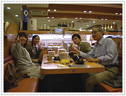 จากนั้นก็กลับบ้าน ถึงประมาณ 4.30 น. เจอ Taka อยู่บ้านคนเดียว แล้วก็ขึ้นมาจัดกระเป๋าเตรียมไว้ ประมาณ 6 โมง กว่าก็ลงไปอาบน้ำ เห็น Taka เล่น Wii คนเดียว เล่นคนเดียว ไม่เหงาหรอ 55 จากนั้นก็นั่งเขียนไดอารี วันนี้รอให้ Otosan กลับมาตอนประมาณ 2 ทุ่มแล้วทุกคนก็ไปกินอาหารข้างนอกกัน Taka เป็นคนขับรถ วันนี้ไปกินซูชิ หมุนๆ 55พอไปถึง เค้าก็ให้เรานั่งข้างใน จะได้ถ่ายรูปได้ 55 แล้วก็ต้องคอยหยิบจานซูชิให้เค้าด้วย 55 ซูชินี่จะมีแบบ รอมันหมุนมา กับถ้าไม่อยากรอก็สั่งเอาได้ ถ้าสั่งก็กดที่หน้าจอ เลือกที่ต้องการ จากนั้นก็จะมี shinkansea วิ่งมาส่งซูชิ ได้ทีละ 4 จาน 55เราก็สนุกใหญ่เลย 55 มีของเล่นใหม่แล้ว55 ชอบรถไฟ อยู่ด้วย เรากินได้ไม่เยอะ ได้แค่ประมาณ 6 จาน (จานละ 2 ชิ้น) กับไข่ตุ๋น 1 ถ้วย ก็ไม่ไหวแล้ว แล้วตอนกินซูชิอ่ะ บนข้าว มันจะมีวาซาบิ อยู่อ่ะ เราก็ไม่มีปัญหาอะไร ไม่เผ็ดนะ แต่ Taka และ Aiko นี่จิ๊ดมากอ่ะ สักพัก Aiko เริ่มไม่ไหวกับวาซาบิแล้ว ก็คีบตรงวาซาบิให้ Taka แต่ Taka คีบมาใส่ปากเรา ซะงั้นอ่ะ แล้วเค้าก็ดูว่าเราจะรู้สึกยังไง แต่ก็เฉยๆ อ่ะ แล้วเค้าก็บอกเราแปลกจัง กินวาซาบิได้ขนาดนั้น 55
